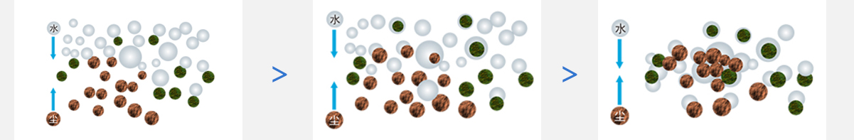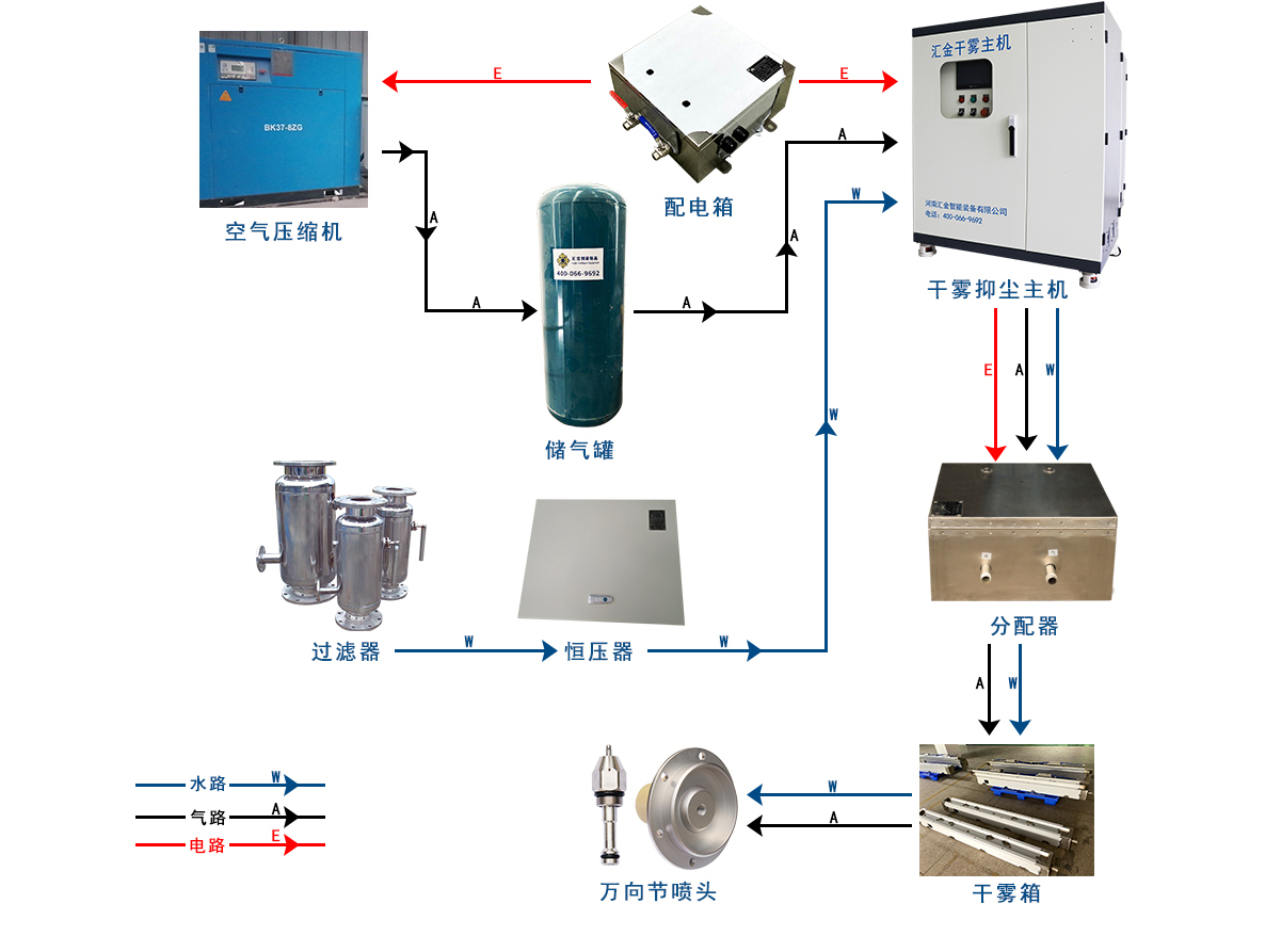 • 向正在作業的粉塵外逸區域內噴射壓力水霧化的細小水滴,在粉塵產生區域形成微霧。把作業時產生的大量的粉塵包裹在水霧內,水霧與粉塵顆粒發生非彈性碰撞。